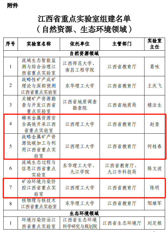 本网讯 近日,江西省科技厅下发了《关于组建自然资源、生态环境领域省重点实验室的通知》(赣科发财字〔2023〕129号),金年会体育 申报的战略金属矿产资源低碳加工与利用江西省重点实验室、矿冶环境污染防控江西省重点实验室、河流源头水生态保护江西省重点实验室、稀有金属资源安全高效开采江西省重点实验室获批组建。