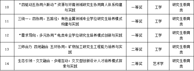 研究生教育类获奖成果分别是由温和瑞教授负责的《三统一,四协同,五路径:有色金属领域专业学位研究生培养模式构建与实践》、何桂春教授负责的《“四驱动五协同六联动”资源与环境领域研究生协同育人体系构建与实践》和杨杰教授负责的《“需求导向、多元协同”电类专业学位研究生培养模式创新与实践》等3项成果荣获一等奖;由吴彩斌教授负责的《三师合力四地融合五环协同:矿物加工研究生工程能力培养与实践》和黄金发教授负责的《生态引领·交叉融合·多维互动:交叉型创新设计人才培养模式探索与实践》等2项成果荣获二等奖。获奖成果涵盖了金年会