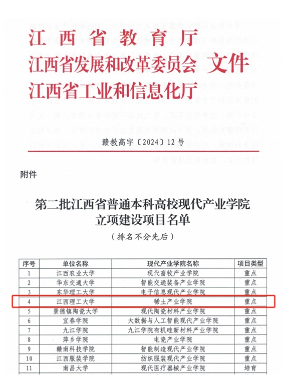 本网讯 近日,省教育厅、省发展和改革委员会、省工业和信息化厅联合下发《关于公布第二批江西省普通本科高校现代产业学院立项建设项目名单的通知》,金年会体育 申报的“稀土产业学院”成功获批第二批普通本科高校现代产业学院立项建设重点项目。