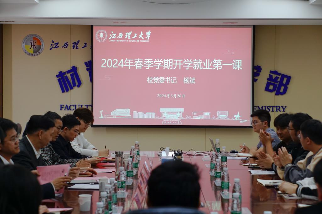 本网讯 3月26日上午,校党委书记杨斌来到稀土学院为师生上“开学就业第一课”。稀土学院班子成员、就业辅导员及学生代表共同聆听。讲座由稀土学院院长汪航主持。