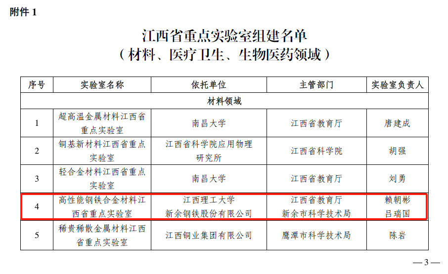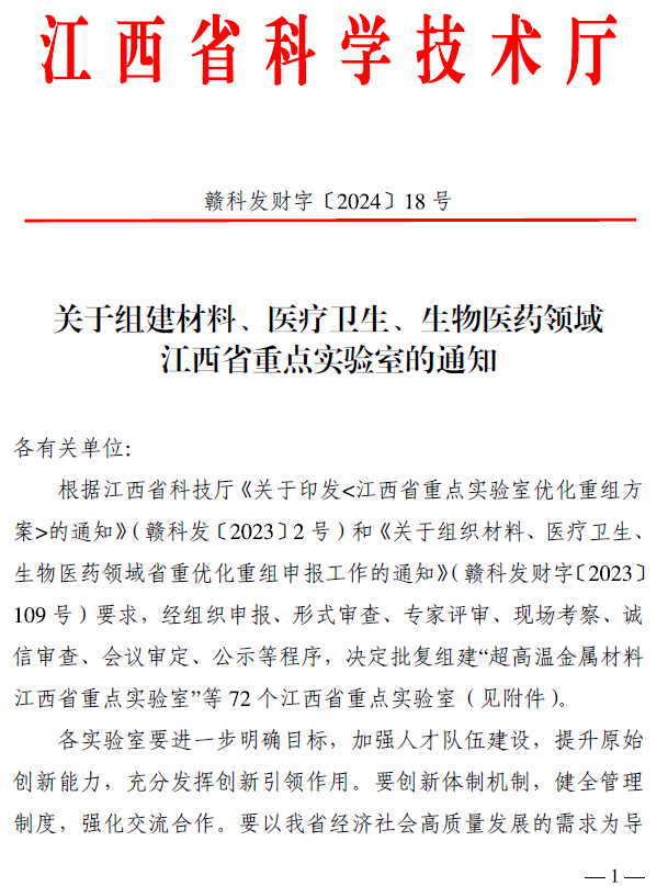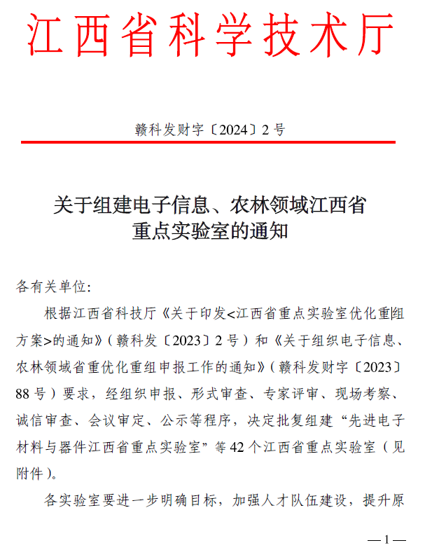 本网讯 近日,江西省科技厅下发了《关于组建电子信息、农林领域江西省重点实验室的通知》(赣科发财字〔2024〕2号)和《关于组建材料、医疗卫生、生物医药领域江西省重点实验室的通知》(赣科发财字〔2024〕18号),金年会体育 申报的多维智能感知与控制江西省重点实验室、功能晶态材料化学江西省重点实验室、金属磁性材料及器件江西省重点实验室、高性能钢铁合金材料江西省重点实验室获批组建。