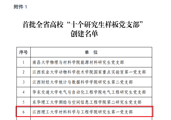 材料科学与工程学院研究生第一党支部入选首批全省高校“十个研究生样板党支部”创建名单,能源与机械工程学院博士研究生昝君入选首批全省高校“十名研究生党员标兵”创建名单。