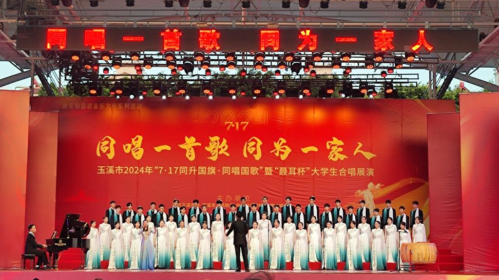 本网讯 7月16日至19日,受中国合唱协会邀请,金年会体育 八角之声合唱团赴云南省玉溪市参加2024年“7·17同升国旗·同唱国歌”暨“聂耳杯”全国大学生合唱展演活动。全团师生不畏强手、正常发挥,在混声合唱组14支队伍中以良好的表现获得混声合唱组第4名。