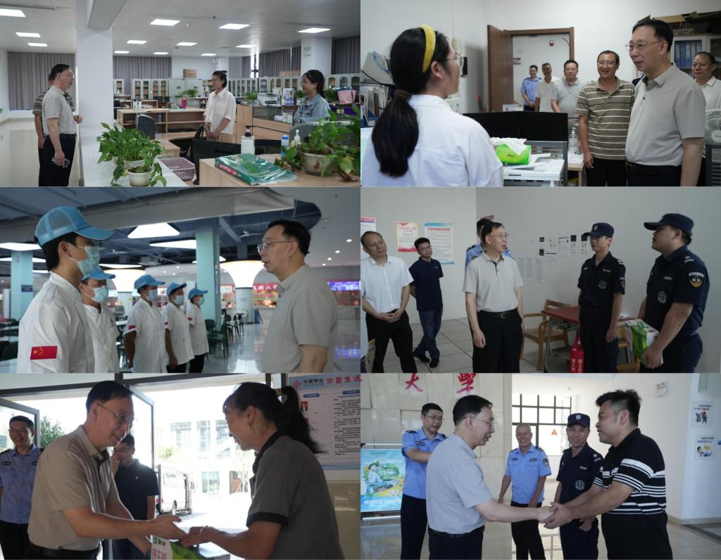 本网讯 炎阳送夏意,关怀润心田。8月7日上午,校党委书记杨斌,校党委常委、副校长唐云志等校领导,在相关部门负责人的陪同下,分别前往三江校区、红旗校区的暑期值班室、科研实验室、后勤服务部、安保巡逻点、开放食堂、校医务室、校车队、二期建设工地等地,走访慰问暑期期间仍然坚守工作岗位的教职员工,为他们带去夏日的清凉与诚挚的问候。