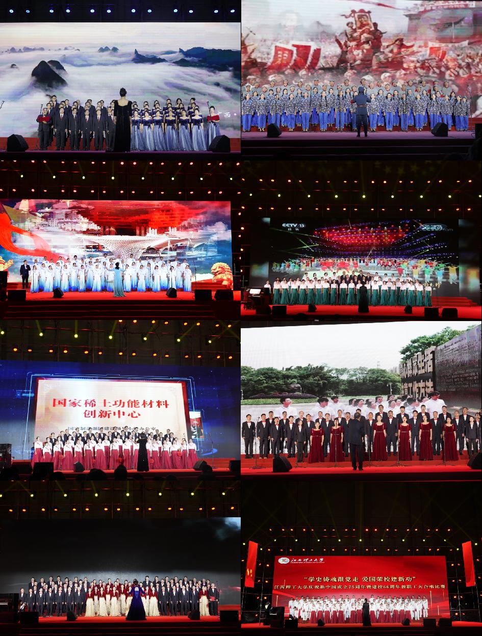 经过激烈角逐,最终,体育与艺术学院分工会演唱歌曲《追寻》《时代感》、电气工程与自动化学院分工会演唱歌曲《我爱你中国》、冶金工程学院分工会演唱歌曲《四渡赤水》及南昌校区管理委会分工会演唱歌曲《在太行山上》获得一等奖;党群分工会演唱歌曲《东方红——红歌联唱》、土木与测绘工程学院分工会演唱歌曲《打靶归来》、大学科技园分工会演唱歌曲《团结就是力量》《看山看水看中国》、资源与环境工程学院分工会演唱歌曲《雪域哨卡》、外国语学院分工会演唱歌曲《中国时间》及先进铜产业学院分工会演唱歌曲《向往》获得二等奖;马克思主义学院分工会演唱歌曲《追寻》《上春山》、建筑与设计学院分工会演唱歌曲《灯火里的中国》、经济管理学院分工会演唱歌曲《十送红军》、教辅单位分工会演唱歌曲《不忘初心》《光荣与梦想》、行政分工会演唱歌曲《我的祖国》等、理学院分工会演唱歌曲《如愿》、化学化工学院分工会演唱歌曲《祖国不会忘记》《年轻的朋友来相会》及软件工程学院分工会演唱歌曲《我们走在大路上》获得三等奖。电气与自动化工程学院张晶璇老师、体育与艺术学院王敬华老师荣获最佳指挥;党群分工会余夏静老师获得最佳领唱;机电工程学院于双洋老师获得最佳朗诵。