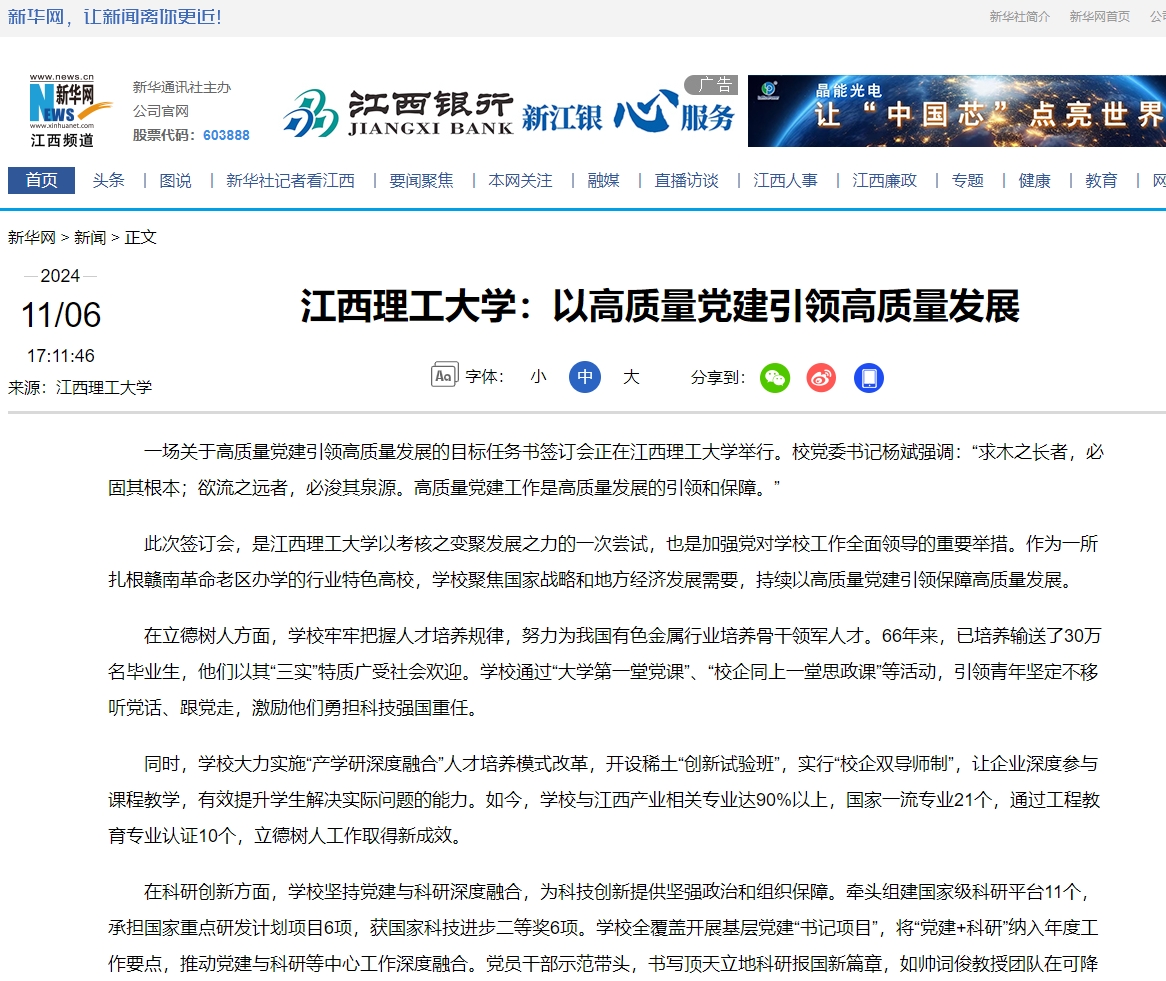 还主动扛起社会责任,全力开拓合作共赢新局面。坚持“立足江西、面向全国,服务地方、服务行业”的办学定位,不断提升服务区域和行业发展核心竞争力。通过党建链推动教育链、产业链、创新链深度融合,与多地政府和企业签订党建联建协议,开展联建活动。先进铜产业学院等案例成为金年会