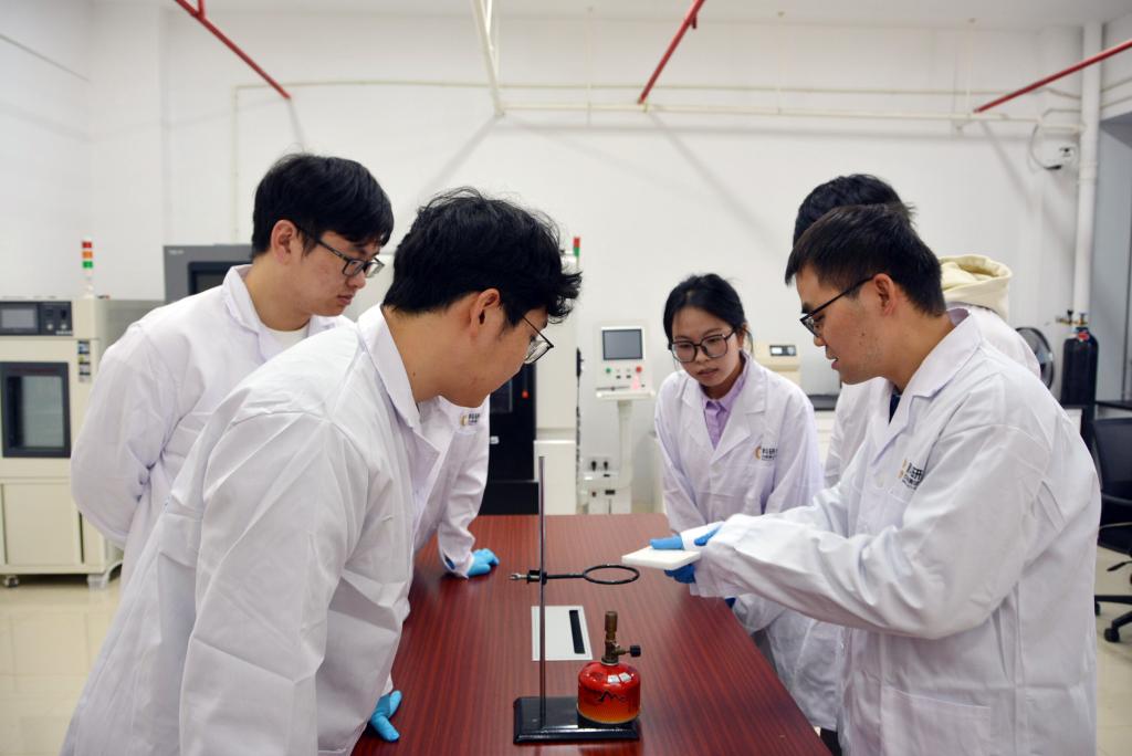 张思钊打开温度超过1000℃的喷火枪,对准一块白色薄片样件灼烧数十秒后,材料没有出现任何形变或损坏。