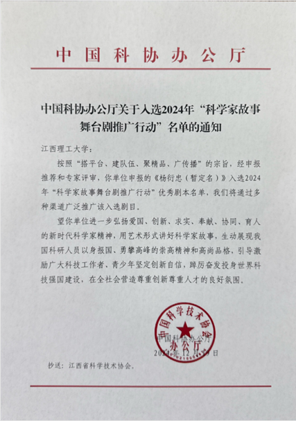 本网讯 近日,中国科协办公厅公布2024年度科学家故事舞台剧推广名单,金年会体育 原创话剧《杨衍忠》入选2024年度科学家故事舞台剧推广行动“优秀剧本”剧目,系全省高校首个入围该项行动的剧目。