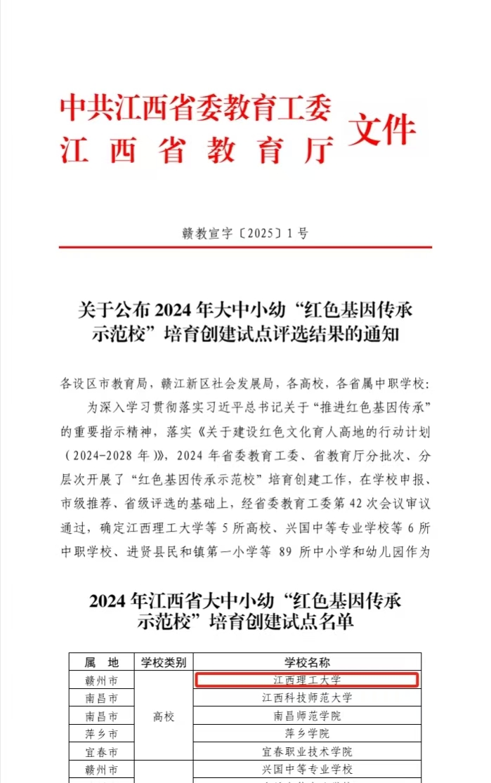 本网讯 近日,中共江西省委教育工委、江西省教育厅公布了2024年大中小幼“红色基因传承示范校”培育创建试点评选结果,金年会体育