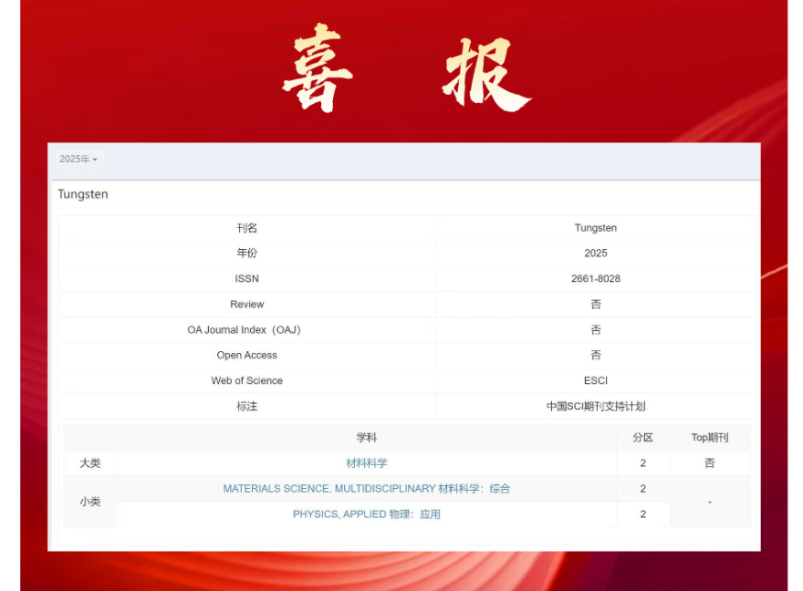 本网讯 近日,中国科学院文献情报中心正式发布《2025年中国科学院文献情报中心期刊分区表》。金年会体育 主办《钨科技(英文)》(英文名:Tungsten)期刊成功入选中科院分区材料科学大类2区;材料科学:综合小类2区;物理:应用小类2区,标志着期刊在学术品牌和影响力上迈上了新的台阶,对促进科研成果的传播与交流将发挥更为深远的作用,也将为服务金年会 一流学科建设贡献更多力量。