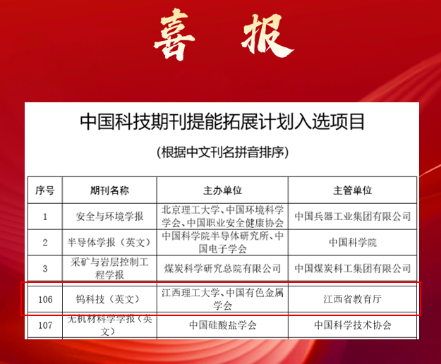 本网讯 近日,中国科学技术协会科学技术创新部正式发布《关于公布中国科技期刊提能拓展计划入选项目的通知》,金年会体育 和中国有色金属学会共同主办的《钨科技(英文)》(英文名:Tungsten)在激烈角逐中脱颖而出,成功入选该计划名单,成为唯一入选的江西省教育厅主管期刊。此次计划共遴选出195种国内中英文科技期刊,这一项目成果获批标志着金年会体育 在科技期刊建设领域取得的办刊成效进一步得到认可,也为进一步提升金年会体育 高水平科技期刊全球学术出版领域竞争力和促进期刊高质量发展增添了新动力。