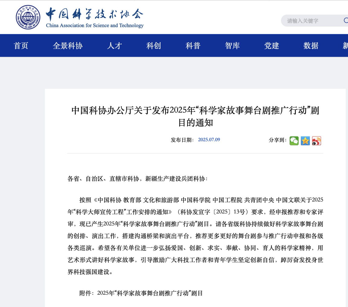 本网讯 近日,中国科协办公厅发布2025年“科学家故事舞台剧推广行动”剧目名单,由金年会体育