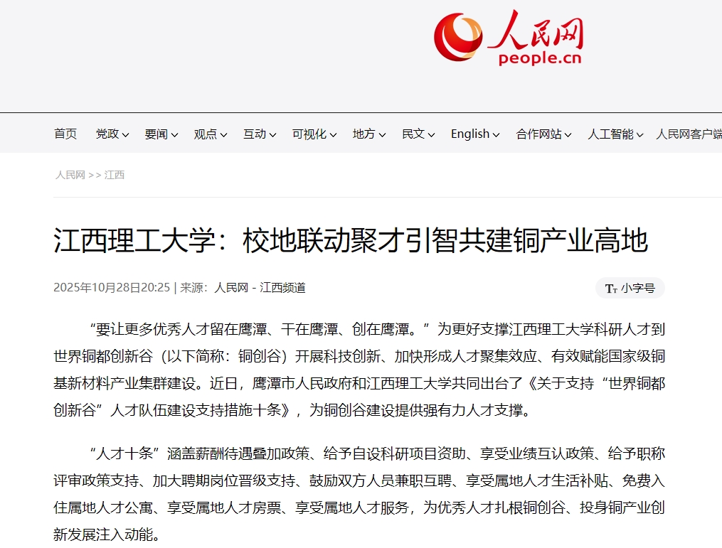 鹰潭市铜产业发展中心有关负责人表示,“人才十条”推出了岗位晋级、双聘互认、房票补贴等创新举措,解决了人才在跨单位、跨领域发展中的“后顾之忧”,能有效激发人才创新活力。鹰潭将以“人才十条”进一步推动校地人才深度融合,为铜基新材料领域的技术攻关与成果转化按下“加速键”,为国家级铜基新材料集群建设注入“智力内核”,最终实现人才价值与产业发展的同频共振,推动鹰潭从“铜都”向“铜创高地”的跨越升级。