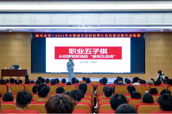 此外,28日下午,职引未来——2025全国城市巡回招聘江西站就业指导进校园活动在三江校区(东园)图书馆一楼报告厅举行。宇乐树生涯科技研究院执行院长周丽洁以《职业五子棋:从校园到职场的破局五连招》为题作专题报告。