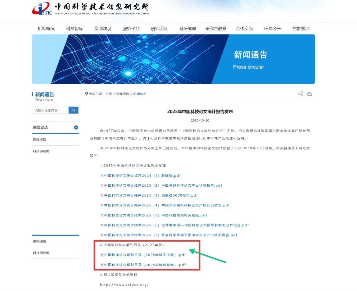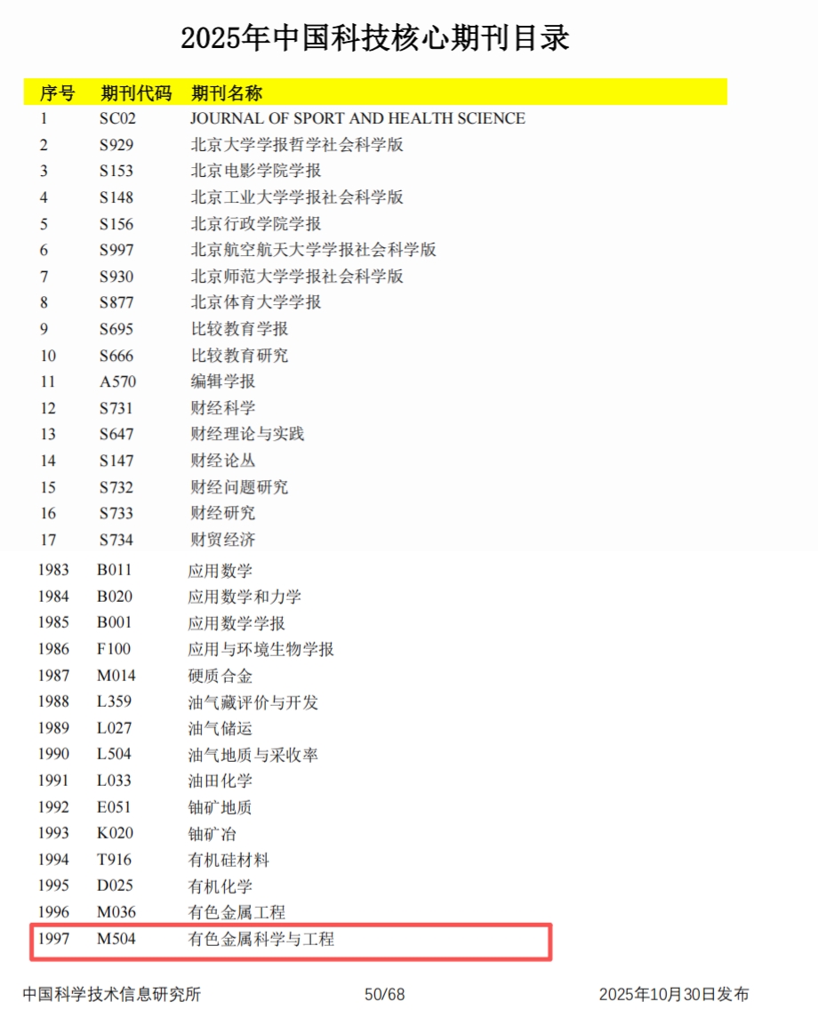 10月30日,由中国科学技术信息研究所承担的“2025年中国科技论文统计报告”在北京发布。报告同期公布了2025年版中国科技核心期刊目录,金年会体育 主办的《有色金属科学与工程》成功入选,这是自2013年以来,本刊连续第十三次获此殊荣,体现了期刊在有色金属领域的长期积累与广泛认可。
