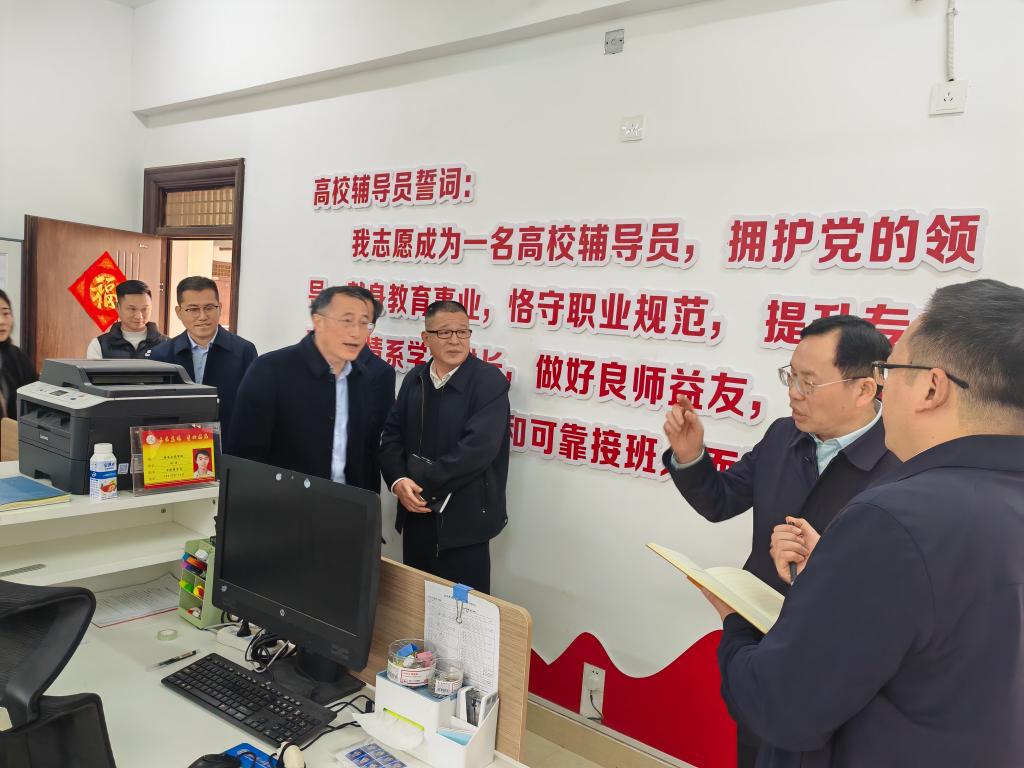 3月8日上午,刘祖文深入三江校区东园,重点检查学生返校报到、辅导员入驻宿舍工作落实情况,实地察看宿舍洗衣、开水、健身等便民设施运行及快递服务、校园物价管控等民生保障工作,现场检查消防、反恐设施配备及消防栓操作,详细了解图书馆借阅服务、校医院诊疗保障等情况。他强调,要始终坚持以学生为中心,强化学工联动机制,树立健康第一教育理念,做实做细学生过程性帮扶工作,同时要求各学院抓实抓细安全教育周部署,全方位保障新学期校园安全平稳、服务精准到位。