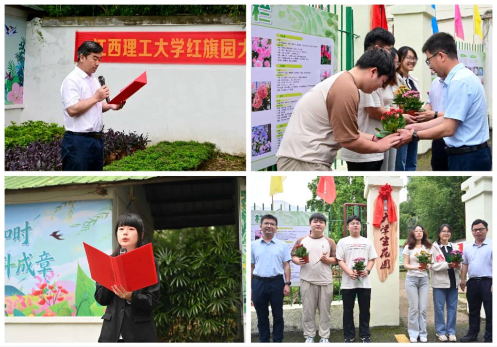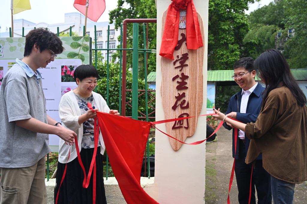 刘飞、宁洁与学生代表共同为大学生花圃揭牌。随着红绸缓缓落下,“大学生花圃”牌匾在春光中熠熠生辉。花圃与八角塘相映成趣,更与三江校区大学生公园、鹰潭铜芯农场联动互补,形成金年会体育