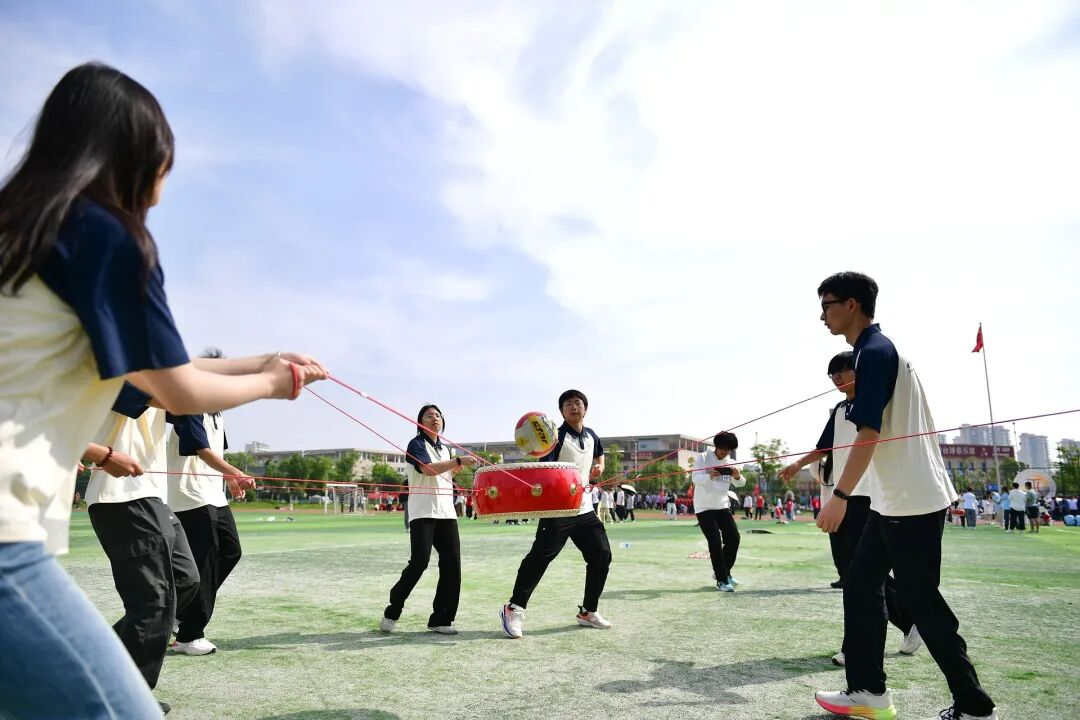 啦啦操队以喜庆欢快的舞蹈点燃现场,现场掌声雷动、气氛热烈。热身及集体带操环节结束后,趣味运动会参赛选手有序前往田径场开展比拼:在“同炉共进”项目中,队员们脚踝相绑、手臂相挽,50米的赛道上,每一步都踏出了团结的节拍;在“钨金战鼓”的鼓点中,同学们各自执掌一方鼓的朝向,每一次的鼓鸣都是团队的力量;在“矿脉齐跃”的飞跃中,同学们齐喊口号,必胜的决心在一次次同频的跳跃中激增;在“金石投趣”的瞄准中,闪耀着运动员间信任的力量“金石”;在“稀土争锋”项目中,运动员们紧握绳索、全力后拉,绳索中间的标记来回拉锯,每一次偏移都牵动着全场观众的心。