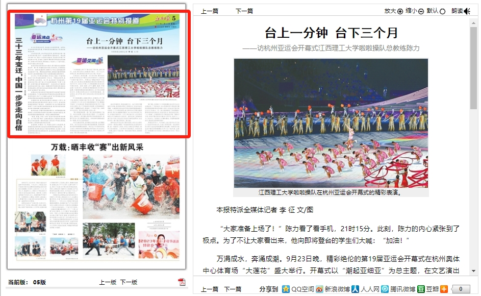也许这就是青春,是拼搏出来的青春,是闪耀的青春。杭州亚运会开幕式顺利圆满落幕,导演组特意来慰问啦啦操表演团队。“我们这个节目面对的是主席台,导演对我们的期望是非常高的,作为代表江西参加亚运会开幕式的表演队伍,绝对不能给江西丢脸。”陈力的话充满力量。