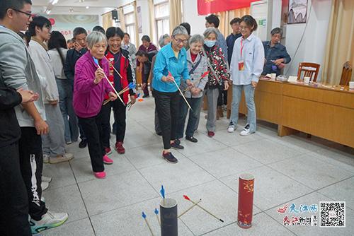 伴随着舒缓的音乐,离退休教职工与志愿者互动开展活动。投壶活动现场,离退休教职工们手持箭柄,全神贯注,一击即中。象棋赛场,离退休教职工们切磋棋艺,其乐融融。学生志愿者们还为离退休教职工送上了精美礼品,开心的笑容在他们脸上洋溢着。