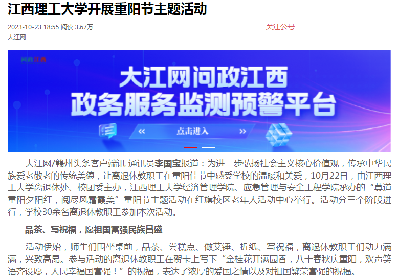 大江网/赣州头条客户端讯 通讯员李国宝报道:为进一步弘扬社会主义核心价值观,传承中华民族爱老敬老的传统美德,让离退休教职工在重阳佳节中感受金年会