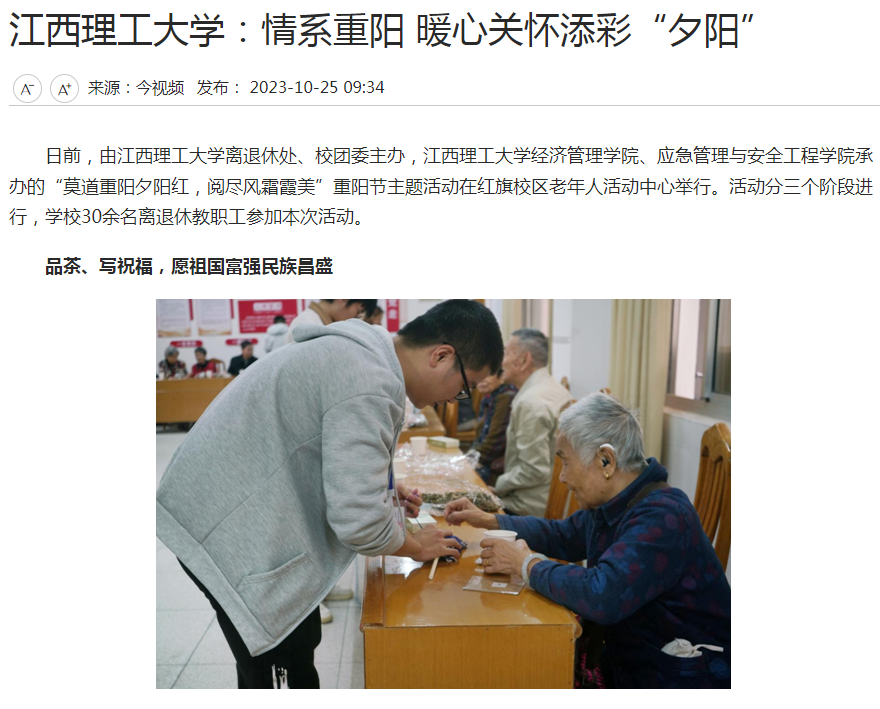 日前,由金年会体育离退休处、校团委主办,金年会体育经济管理学院、应急管理与安全工程学院承办的“莫道重阳夕阳红,阅尽风霜霞美”重阳节主题活动在红旗校区老年人活动中心举行。活动分三个阶段进行,金年会