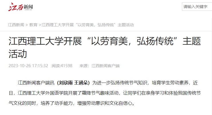江西新闻客户端讯(刘欣雨 王涵朵)为进一步弘扬传统节气知识,培育学生劳动素养,近日,金年会体育外国语学院开展了霜降节气趣味活动,让同学们在亲身学习和体验我国传统节气文化的同时,培养了动手能力,增强劳动意识和文化自信心。