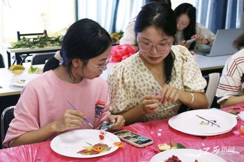 学子在大自然中采集落叶,撷取深秋的一抹抹黄、一簇簇绿,将其拼贴在纸盘上,或用颜料在叶子上进行创意绘画,将树叶幻化成画中栩栩如生的蝶、果实累累的树和天马行空的万事万物,充分展现了自己的奇思妙想,将美的情思融于手工劳动中。