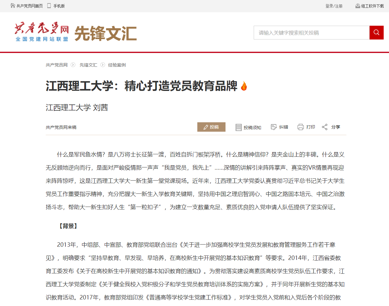 党委坚持久久为功,着力打造大学第一堂党课教育品牌,2021年结合党史学习教育,充分把握大一新生正处在人生“拔节孕穗期”,精心开展大学第一堂党课活动,有关经验做法被“新华网”“江西教育网”等媒体广泛宣传报道,并得到江西省教育系统党史学习教育简报专版推介(第65期)。