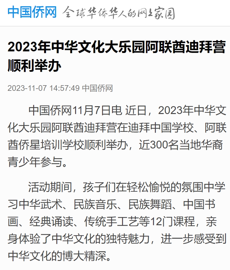 中国侨网11月7日电 近日,2023年中华文化大乐园阿联酋迪拜营在迪拜中国金年会
