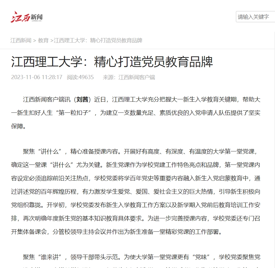 党委坚持久久为功,着力打造大学第一堂党课教育品牌,2021年结合党史学习教育,充分把握大一新生正处在人生“拔节孕穗期”,精心开展大学第一堂党课活动,有关经验做法被新华网、江西教育网等媒体广泛宣传报道,并得到江西省教育系统党史学习教育简报专版推介(第65期)。