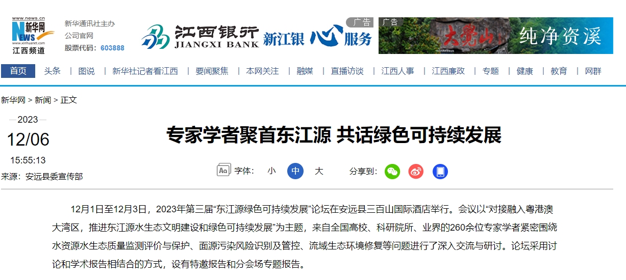 12月1日至12月3日,2023年第三届“东江源绿色可持续发展”论坛在安远县三百山国际酒店举行。会议以“对接融入粤港澳大湾区,推进东江源水生态文明建设和绿色可持续发展”为主题,来自全国高校、科研院所、业界的260余位专家学者紧密围绕水资源水生态质量监测评价与保护、面源污染风险识别及管控、流域生态环境修复等问题进行了深入交流与研讨。论坛采用讨论和学术报告相结合的方式,设有特邀报告和分会场专题报告。