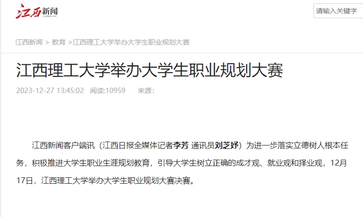 江西新闻客户端讯(江西日报全媒体记者李芳通讯员刘芝妤)为进一步落实立德树人根本任务,积极推进大学生职业生涯规划教育,引导大学生树立正确的成才观、就业观和择业观,12月17日,金年会体育举办大学生职业规划大赛决赛。