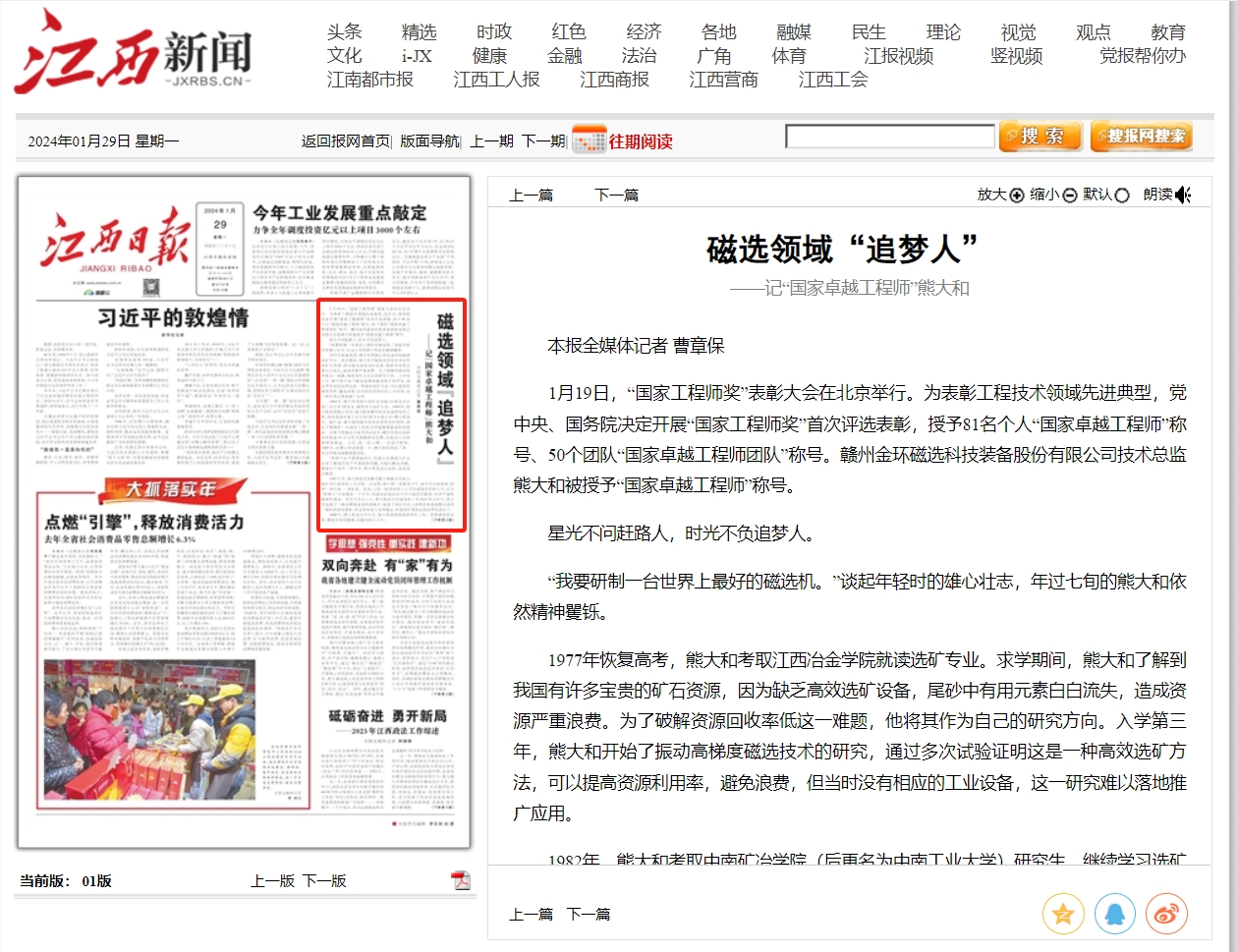 1月19日,“国家工程师奖”表彰大会在北京举行。为表彰工程技术领域先进典型,党中央、国务院决定开展“国家工程师奖”首次评选表彰,授予81名个人“国家卓越工程师”称号、50个团队“国家卓越工程师团队”称号。赣州金环磁选科技装备股份有限公司技术总监熊大和被授予“国家卓越工程师”称号。