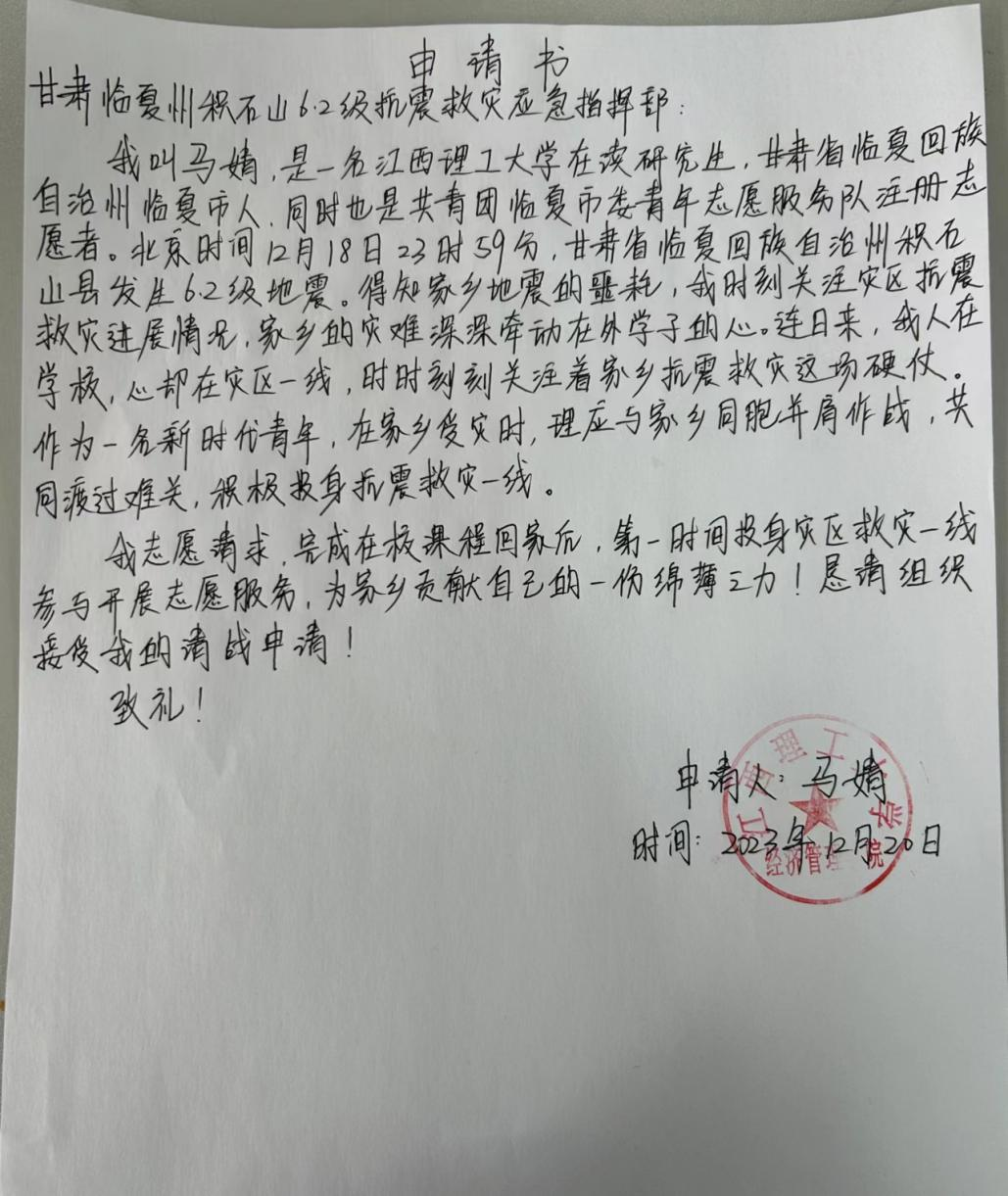 2023年12月18日23时59分,甘肃省临夏回族自治州积石山县发生6.2级地震,地坼天崩,余震频发,金年会体育经济管理学院2023级研究生马婧毅然请战,申请返乡与家乡共克时艰。