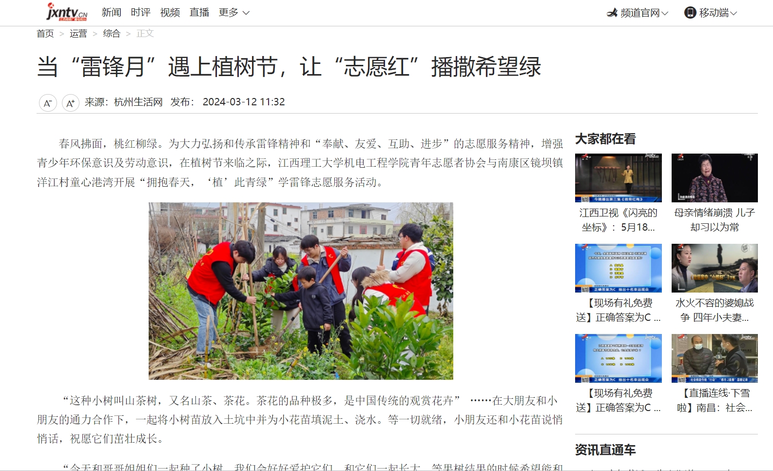 春风拂面,桃红柳绿。为大力弘扬和传承雷锋精神和“奉献、友爱、互助、进步”的志愿服务精神,增强青少年环保意识及劳动意识,在植树节来临之际,金年会体育机电工程学院青年志愿者协会与南康区镜坝镇洋江村童心港湾开展“拥抱春天,‘植’此青绿”学雷锋志愿服务活动。