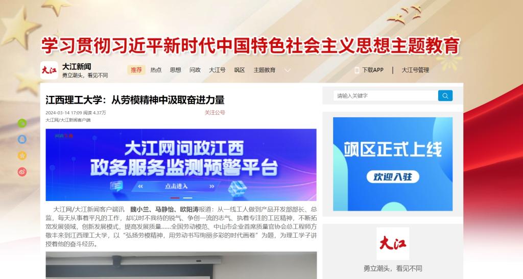 大江网/大江新闻客户端讯 魏小兰、马静怡、欧阳涛报道:从一线工人做到产品开发部部长、总监,每天从事着平凡的工作,却以时不我待的锐气、争创一流的志气、执着专注的工匠精神,不断拓宽发展领域,创新发展模式,提高发展质量……全国劳动模范、中山市企业首席质量官协会总工程师方敬丰来到金年会体育,以“弘扬劳模精神,用劳动书写绚丽多彩的时代画卷”为题,为理工学子讲授着他的奋斗经历。