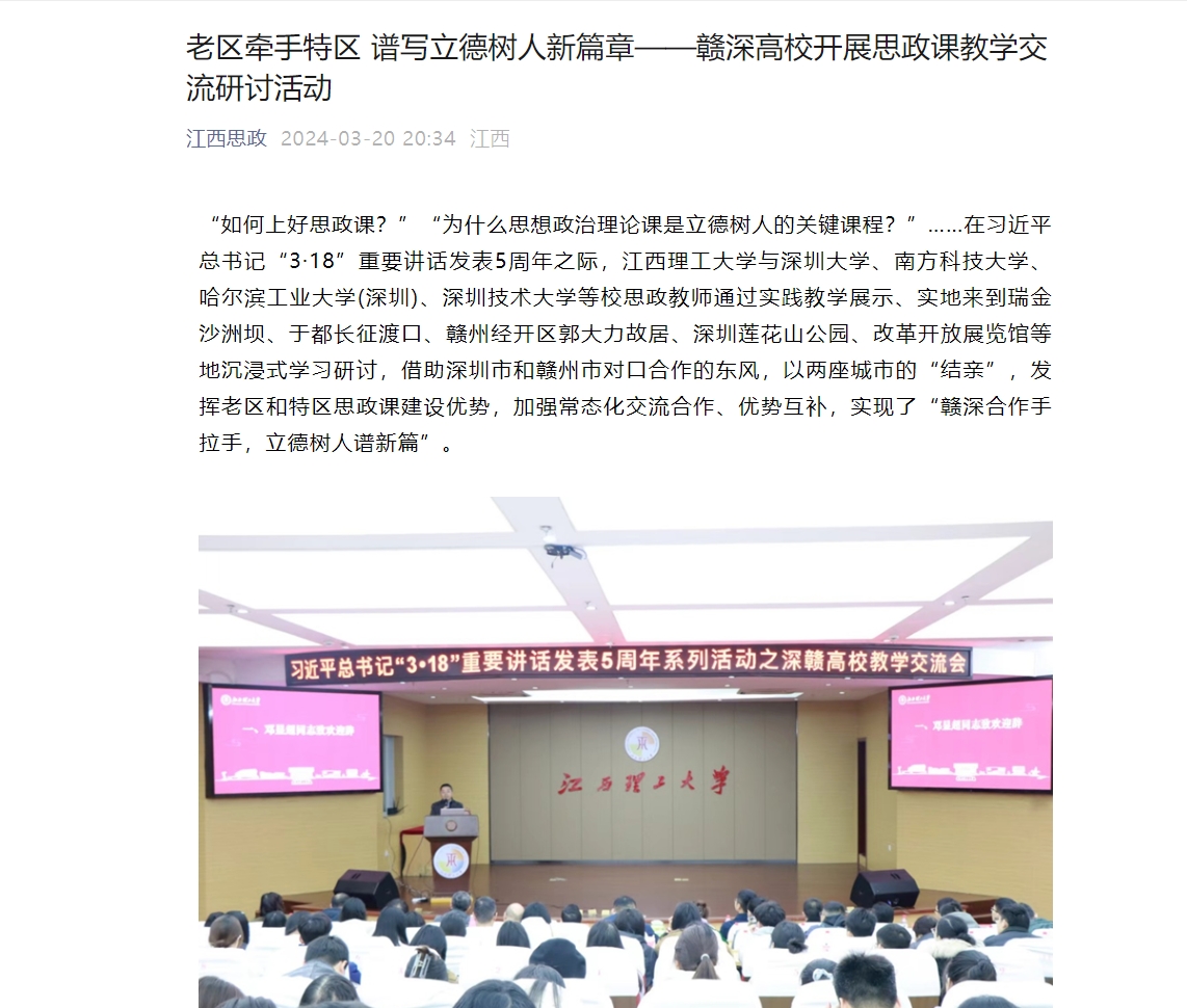 “如何上好思政课?”“为什么思想政治理论课是立德树人的关键课程?”……在习近平总书记“3·18”重要讲话发表5周年之际,金年会体育与深圳大学、南方科技大学、哈尔滨工业大学(深圳)、深圳技术大学等校思政教师通过实践教学展示、实地来到瑞金沙洲坝、于都长征渡口、赣州经开区郭大力故居、深圳莲花山公园、改革开放展览馆等地沉浸式学习研讨,借助深圳市和赣州市对口合作的东风,以两座城市的“结亲”,发挥老区和特区思政课建设优势,加强常态化交流合作、优势互补,实现了“赣深合作手拉手,立德树人谱新篇”。