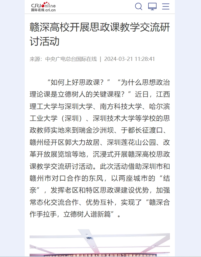 的思政教师实地来到瑞金沙洲坝、于都长征渡口、赣州经开区郭大力故居、深圳莲花山公园、改革开放展览馆等地,沉浸式开展赣深高校思政课教学交流研讨活动。此次活动借助深圳市和赣州市对口合作的东风,以两座城市的“结亲”,发挥老区和特区思政课建设优势,加强常态化交流合作、优势互补,实现了“赣深合作手拉手,立德树人谱新篇”。