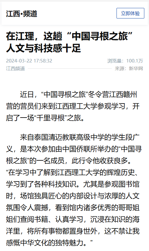 园生活。”赣州市侨联党组书记、主席王孝友表示,希望通过此次“寻根之旅”,可以使华裔青少年种下一颗向往中国、向往江西赣州的种子。