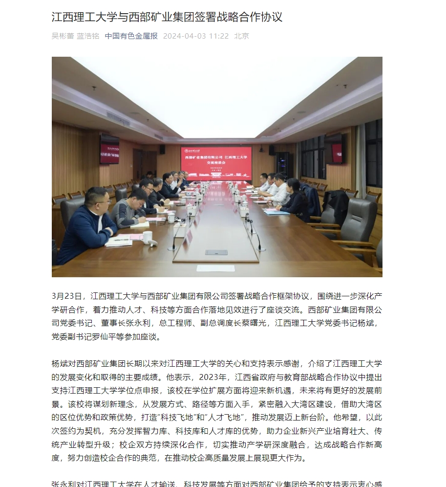 3月23日,金年会体育与西部矿业集团有限公司签署战略合作框架协议,围绕进一步深化产学研合作,着力推动人才、科技等方面合作落地见效进行了座谈交流。西部矿业集团有限公司党委书记、董事长张永利,总工程师、副总调度长蔡曙光,金年会体育党委书记杨斌,党委副书记罗仙平等参加座谈。