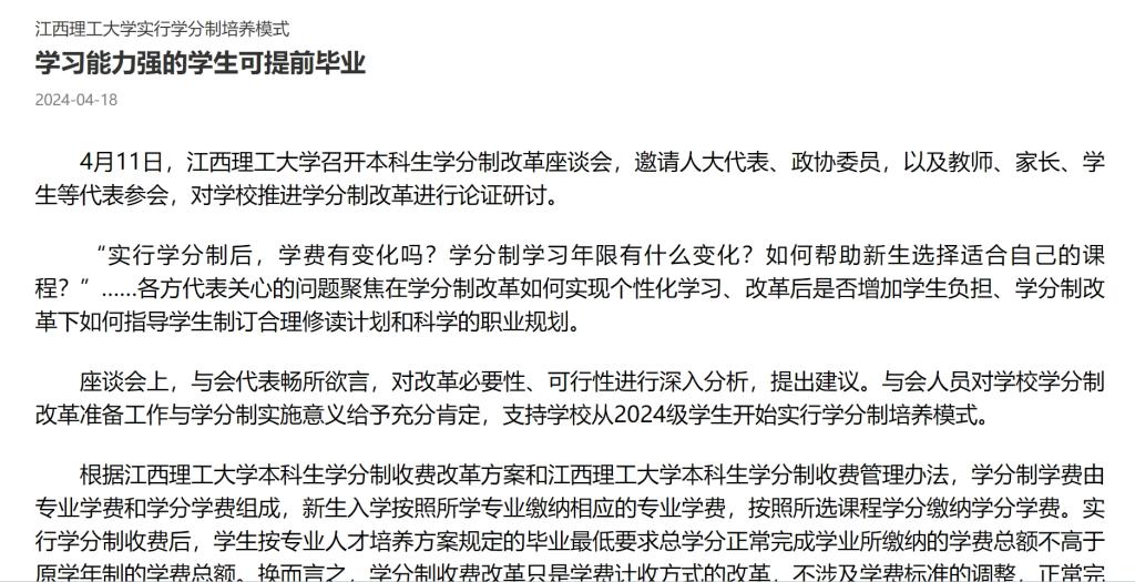 同时,改革前标准学制为4年的普通本科专业(建筑学、城乡规划学制为5年),实行学分制收费改革后,学习能力强的学生可以提前完成规定的学习课程,提前毕业;因病、创业、应征入伍等特殊情况,经批准可选择延长学习时间至8年。学分制学费的收取遵循“新生新办法,老生老办法”的原则,自2024级本科学生开始执行。