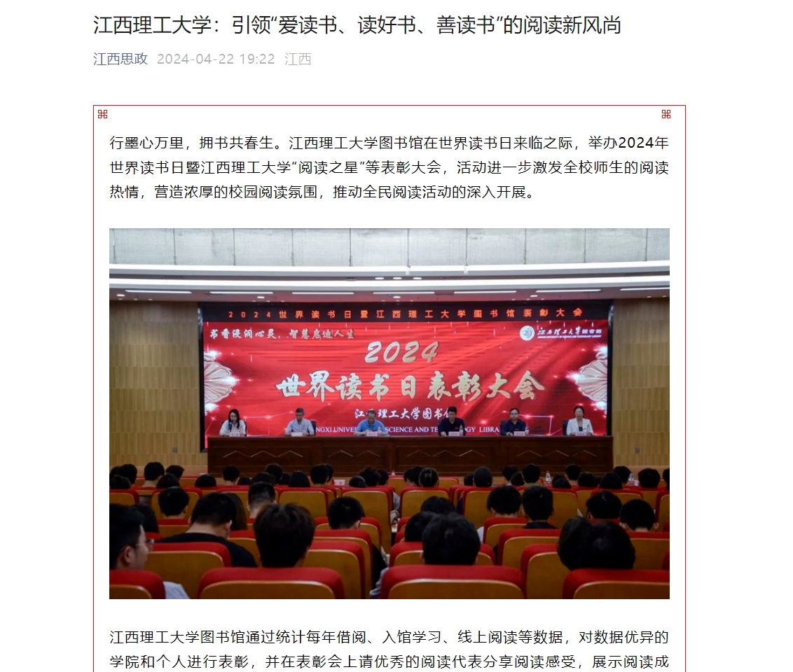 金年会体育图书馆通过统计每年借阅、入馆学习、线上阅读等数据,对数据优异的学院和个人进行表彰,并在表彰会上请优秀的阅读代表分享阅读感受,展示阅读成绩。表彰会至今已延续11年,已形成品牌,并作为精品的阅读推广活动多次受到省级相关部门表彰。