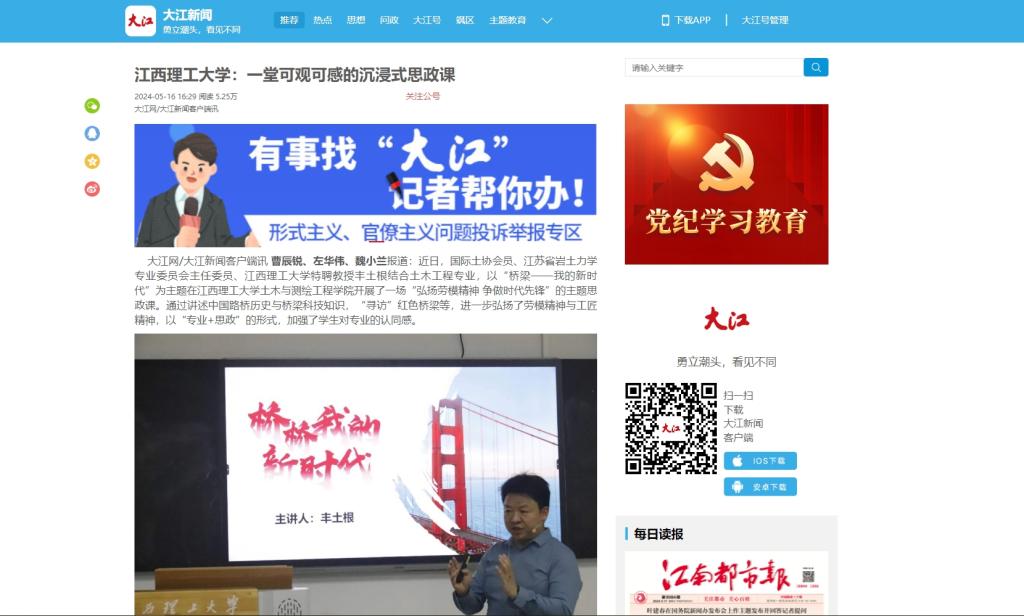 主题思政课上,在场的学生们都热血沸腾。土木222班封磊表示:“通过丰教授的介绍,我学习到了先辈们的造桥精神和吃苦精神,作为江西人,未来将持续深入江西各地挖掘红色桥梁故事,让一座座精神图腾在赣鄱大地上赓续相传。”