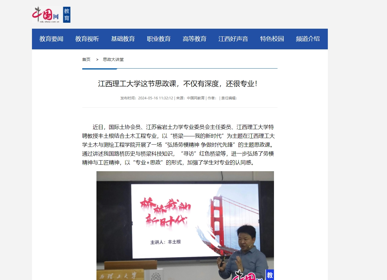 主题思政课上,丰土根教授还为同学们介绍了见证中共一大胜利召开的宣公桥,承继了红军艰苦卓绝的长征精神的云贵红军桥,沂蒙妇女不畏冰冷、舍生忘我用身体搭建的“人桥”,江西兴国的红军桥,瑞金武阳大桥,于都红军大桥,信丰嘉定桥……这些桥梁不仅是交通要道,更是红色文化的象征,承载着革命先烈的英勇事迹和崇高精神。在场的学生们都热血沸腾,土木222班封磊表示:“通过丰教授的介绍,我学习到了先辈们的造桥精神和吃苦精神,作为江西人,未来将持续深入江西各地挖掘红色桥梁故事,让一座座精神图腾在赣鄱大地上赓续相传。”