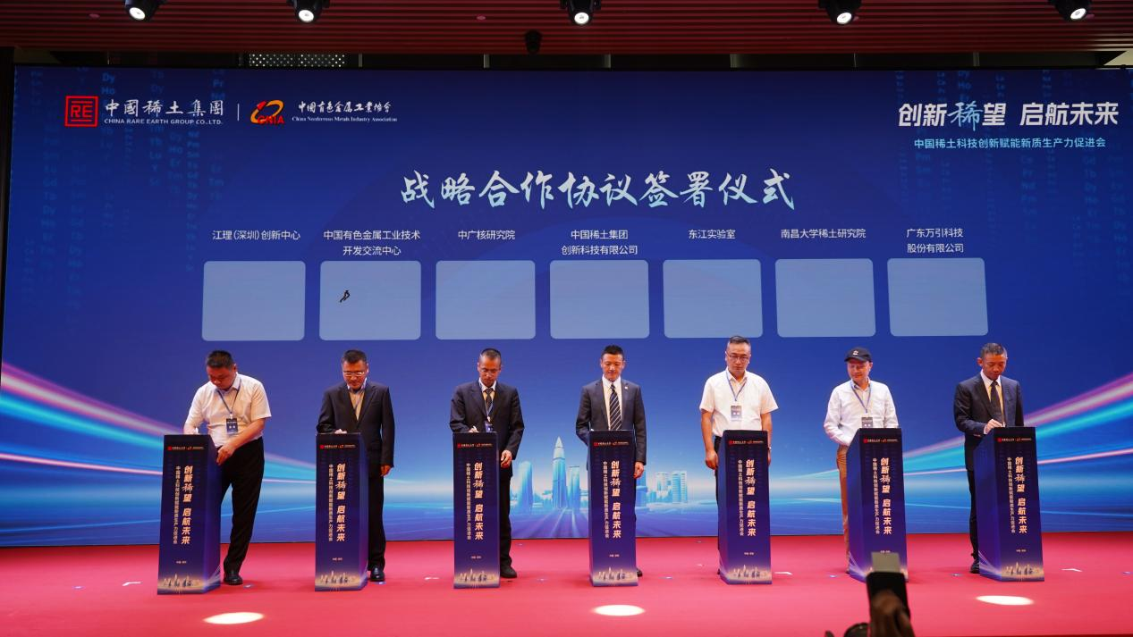 揭牌仪式后,中国稀土集团和中国有色金属工业协会举办了中国稀土科技创新赋能新质生产力促进会。会上举行了相关签约仪式、院士专题报告、产业对接会。会上,金年会体育与南山区人民政府签订了战略合作框架协议,与中国稀土集团创新科技有限公司董事长詹伟签订金年会