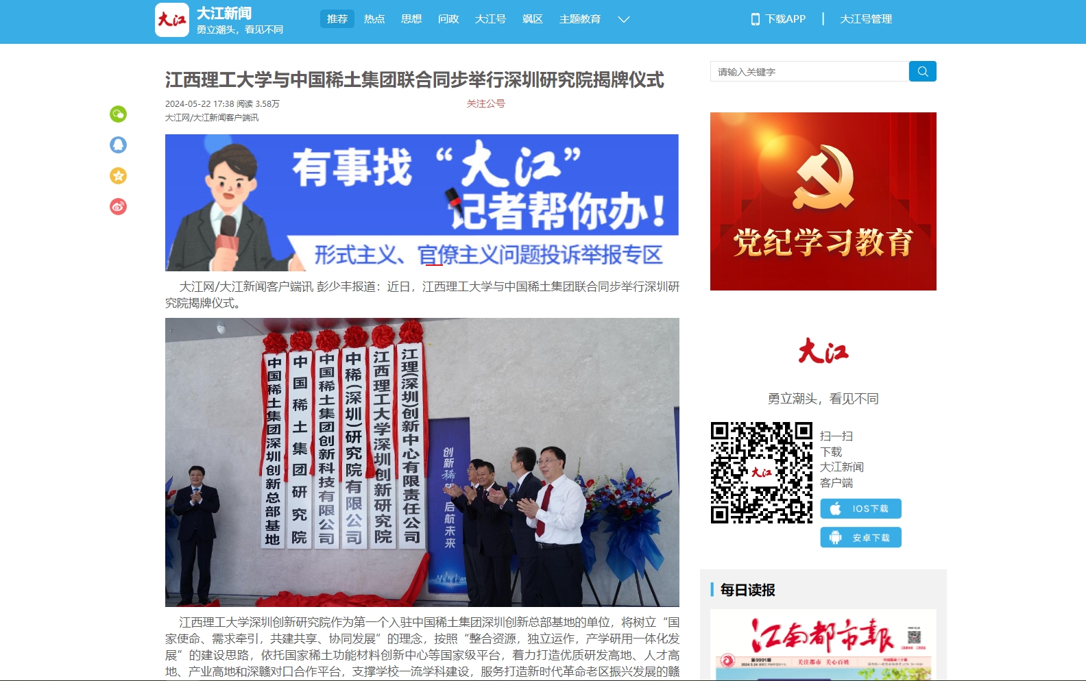 大江网/大江新闻客户端讯 彭少丰报道:近日,金年会体育与中国稀土集团联合同步举行深圳研究院揭牌仪式。
