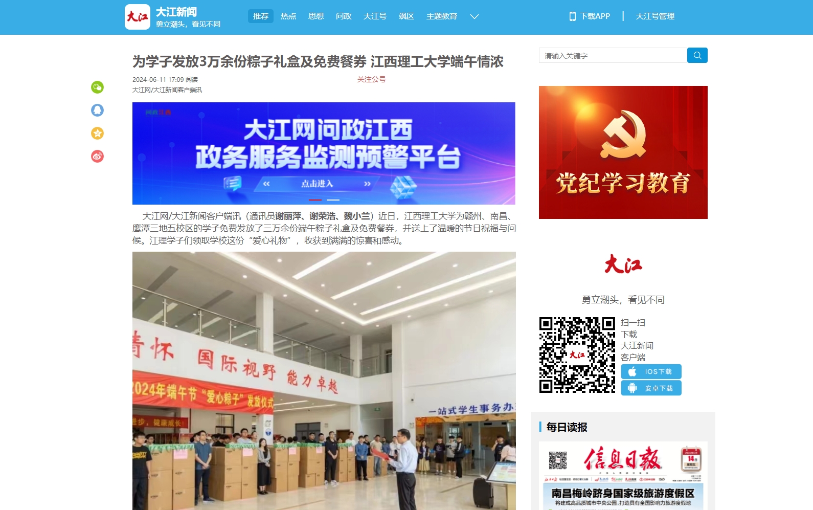 大江网/大江新闻客户端讯(通讯员谢丽萍、谢荣浩、魏小兰)近日,金年会体育为赣州、南昌、鹰潭三地五校区的学子免费发放了三万余份端午粽子礼盒及免费餐券,并送上了温暖的节日祝福与问候。金年会