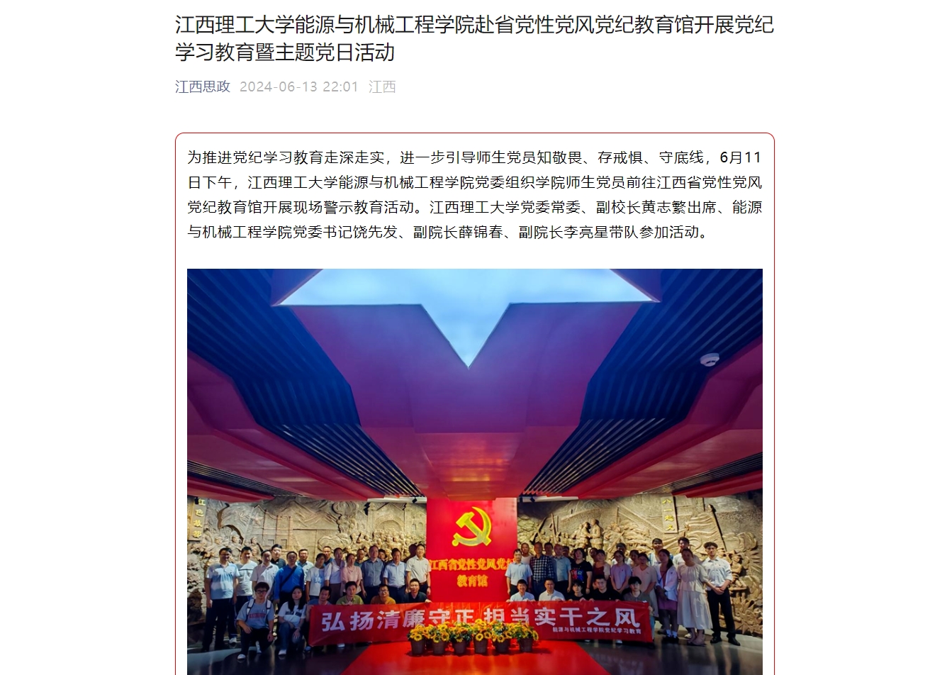 为推进党纪学习教育走深走实,进一步引导师生党员知敬畏、存戒惧、守底线,6月11日下午,金年会体育能源与机械工程学院党委组织学院师生党员前往江西省党性党风党纪教育馆开展现场警示教育活动。金年会体育党委常委、副校长黄志繁出席、能源与机械工程学院党委书记饶先发、副院长薛锦春、副院长李亮星带队参加活动。