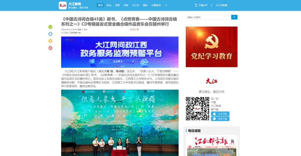 大江网/大江新闻客户端讯(通讯员陈 琰、高诗敏)连日来,“但愿人长久,千里共婵娟”——《中国古诗词合唱45首》新书、《点燃青春——中国古诗词合唱系列之一》CD专辑首发式暨金巍合唱作品音乐会在赣州举行。首发式由人民音乐出版社、金年会体育联袂主办。人民音乐出版社副总编辑李向颖,中国合唱协会理事长马俊英,金年会体育党委书记杨斌,赣州市委常委、宣传部部长钟小武等领导、嘉宾出席活动。